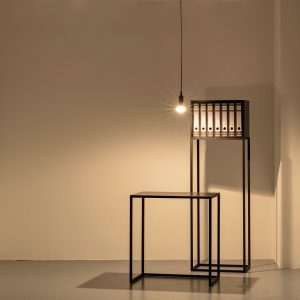 7 file folders, 297 sheets of paper, 297 punched pockets, newspaper clippings, structure in iron and MDF lacquered in black